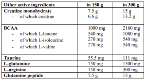 AARDBEIEN SMAAK INGREDIENTEN: dextrose, wei-eiwitconcentraat, glutaminepeptide (bevat tarwe), gebufferd creatine-monohydraat (gemicroniseerd creatine-monohydraat, magnesiumoxide), magere cacaopoeder, schuimer [glucosestroop, kokosvet, magere melkpoeder, wei-eiwitconcentraat, stabilisator (kaliumfosfaten)], creamer [palmvet1, glucosestroop, melkeiwit, antiklontermiddel (siliciumdioxide)], maltodextrine, fructose, verdikkingsmiddel (cellulosegom), natieve wasachtige maïs, emulgator [lecithinen (soja)], aroma, calciumcaseïnaat, L-Glutamine, L-Leucine, wei-eiwitisolaat, L-Isoleucine, L-Valine, L-Arginine, zout, taurine, magnesiumoxide, calciumzouten van citroenzuur, DL-alfa-tocoferylacetaat, nicotinamide , retinylacetaat, D-pantothenaat, calcium, cholecalciferol, thiaminemononitraat, pyridoxinehydrochloride, riboflavine, pteroylmonoglutaminezuur, D-biotine, cyanocobalamine.